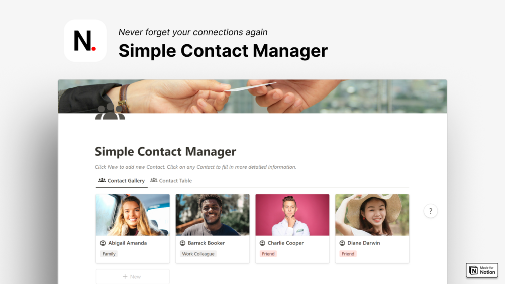Enter Simple Contact Manager - the game-changer in contact organization. No more lost emails or forgotten social profiles. With our guided prompts, effortlessly fill in staple information like emails and social media profiles. The gallery view ensures you never forget a face, making your contact collection not just organized but visually appealing.