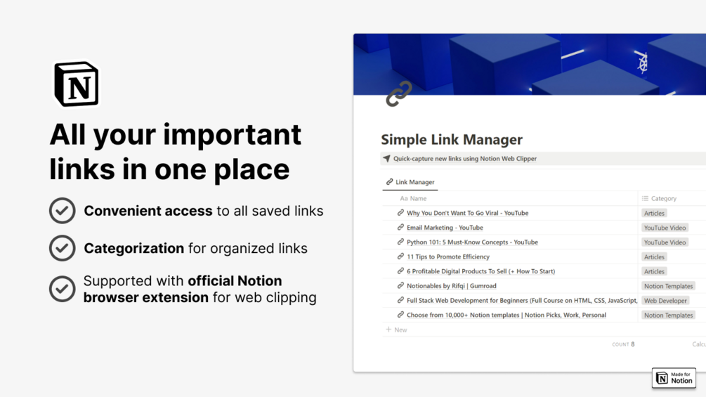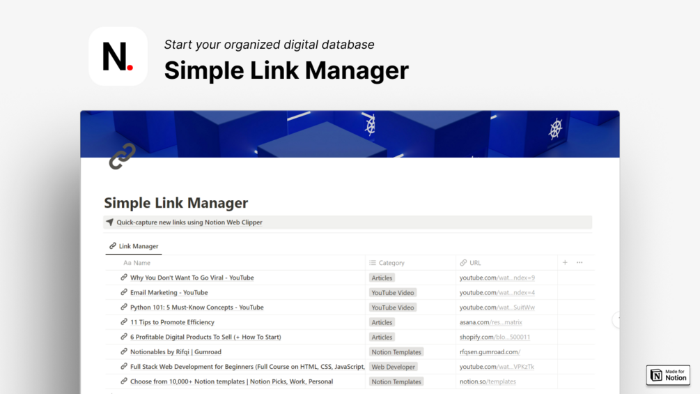 Want all your links in one accessible place? With Simple Link Manager, all your links are stored in one centralized Notion template. Easy to find, easy to manage.